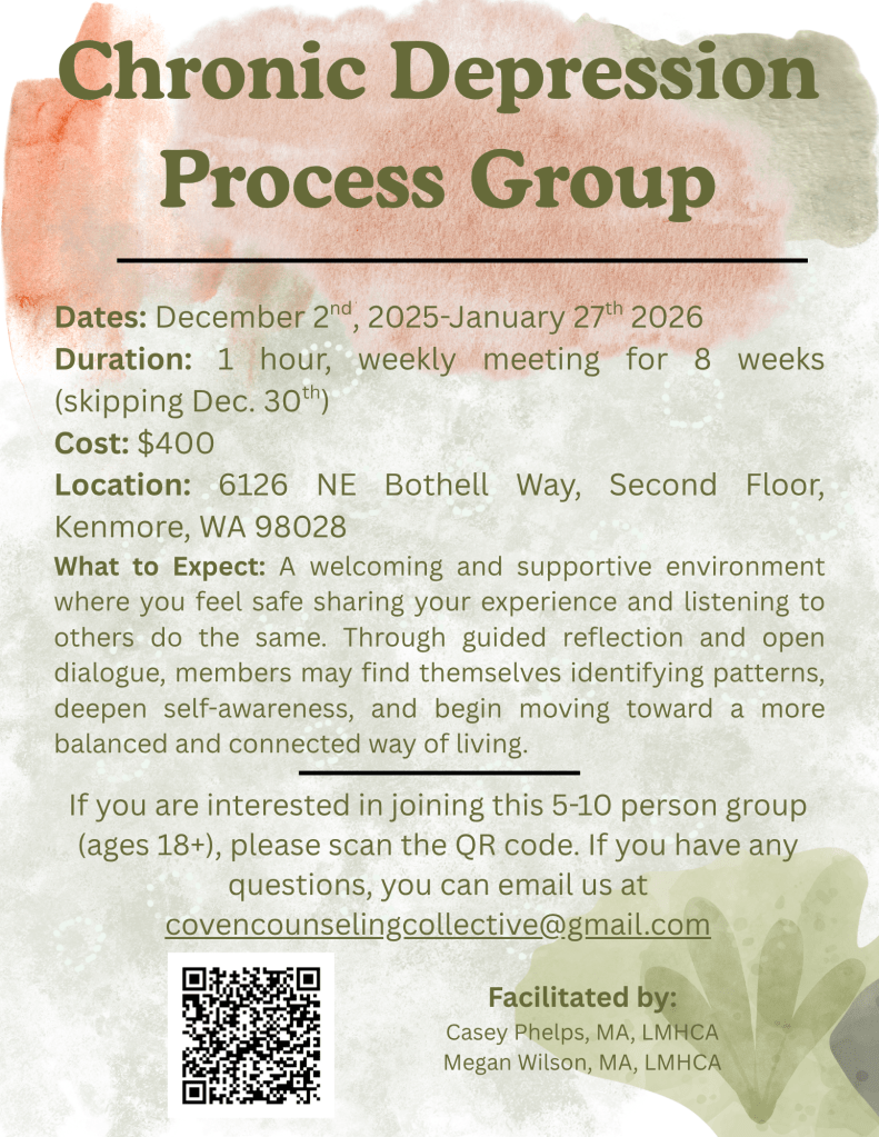About the Group: Chronic depression can feel extremely isolating – like the world is moving forward and you are just standing still. It can be hard to break out of this stuckness and believe that change is possible. This group is here to remind you that you don’t have to face this battle alone. It is a space that offers a sense of safety, support, and opportunities for you to share your experience and explore what it means to others to live with persistent depression. Through guided reflection and open dialogue, members may find themselves identifying patterns, deepen self-awareness, and begin moving toward a more balanced and connected way of living. This group isn’t trying to “fix” you – it is about meeting you where you are at and finding community in a shared human experience so many others struggle with. Discovering healing often begins in the presence of others who see and accept you for who you are. More details can be found on the flyer below